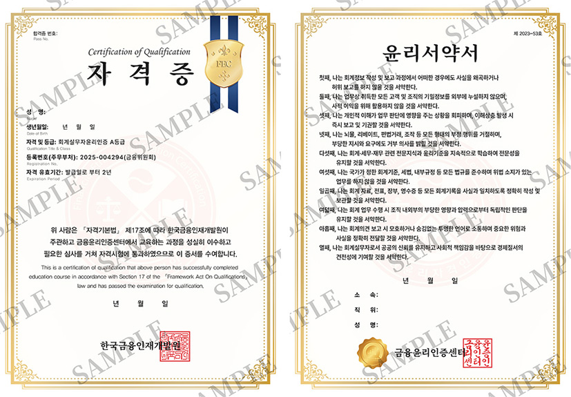 - 금융윤리인증센터에서 제공하는 등록민간자격인 회계실무자윤리인증은 ‘한국금융인재개발원’에서 자격관리·운영을 담당합니다.